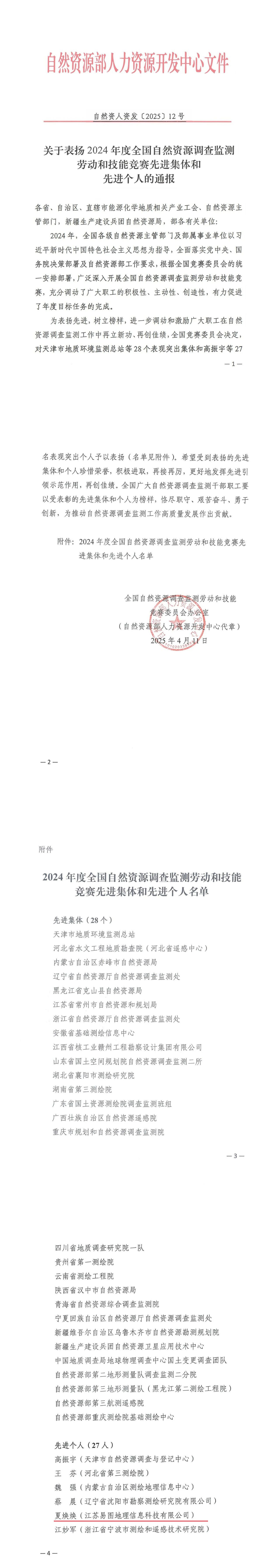4月11日,自然資源部人力資源開發(fā)中心印發(fā)《關于表揚2024年度全國自然資源調查監(jiān)測勞動和技能競賽先進集體和先進個人的通報》,我司夏煥煥同志獲評2024年度全國自然資源調查監(jiān)測勞動和技能競賽先進個人,展現(xiàn)了我司自然資源調查監(jiān)測工作者的風采。